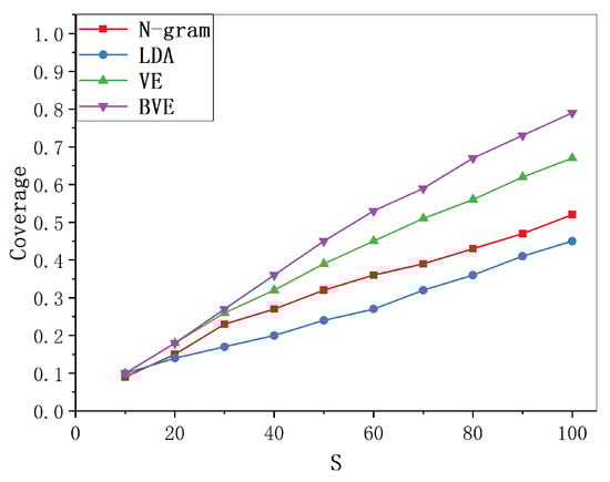 The performance of four different feature extraction methods was compared. Figure 6 shows that the critical field recognition accuracy using the VE algorithm and the LDA model was significantly better than the n-gram model. The VE algorithm’s voting mechanism helped to improve the identification of keyword boundaries, and it was able to more accurately identify key fields than the equal-length field division method used by the n-gram model. In theory, the LDA model was better at extracting subject information from sequences, as it was able to mine sequence topics in short processing fields. However, its recognition accuracy decreased when confronted with a wide variety of keywords and protocol information consisting mostly of long paragraphs. The BVE-based method, which included prior knowledge, had more stable recognition accuracy for the three protocols, which was 10% higher than the standard VE algorithm. Figure 7 shows the simplicity of feature extraction. When using the n-gram method to divide fields, the strategy was too conservative, leading to the phenomenon of protocol format explosion. While the LDA model had a high recognition accuracy, its parameter k was generally too large, leading to a negative correlation between recognition accuracy and simplicity of feature extraction. The BVE-based method had less redundancy, with a ratio of less than 2:1 in the tests for the three protocols. In terms of coverage, as shown in Figure 8, the message coverage rate of the BVE method on the test set reached over 80%, which was higher than the other models and algorithms.