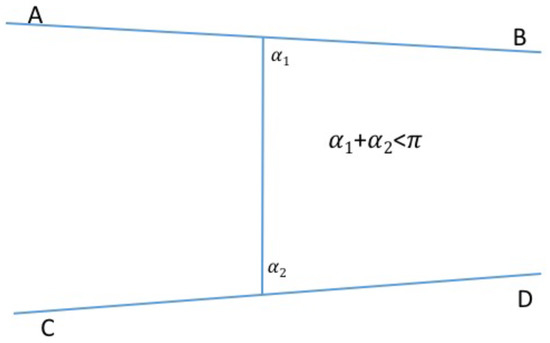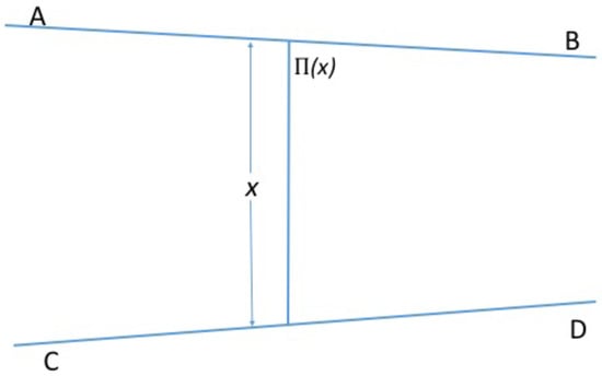 Here, we do not discuss the relative importance, or priority, of the discoverers. Instead, we briefly introduce the concept of the new geometry, without reference to the individual contributions of BGL. In the next Section, we highlight the important milestones in these contributors’ biographies, allowing the reader to judge their priorities for themselves. In the new geometry, apart from the “Euclidean” parallels , the existence of an infinite number of other straight lines, never crossing , is assumed to be possible (see Figure 1). The new “parallelism angle” (which is equivalent to in the Euclidean case) is related to the distance x (see Figure 2) by the formula , in which q is a parameter.