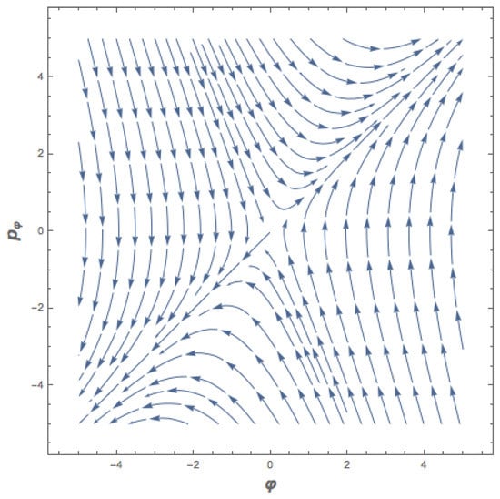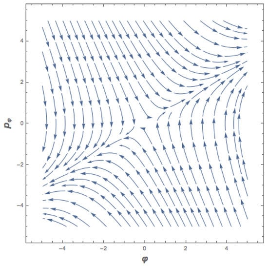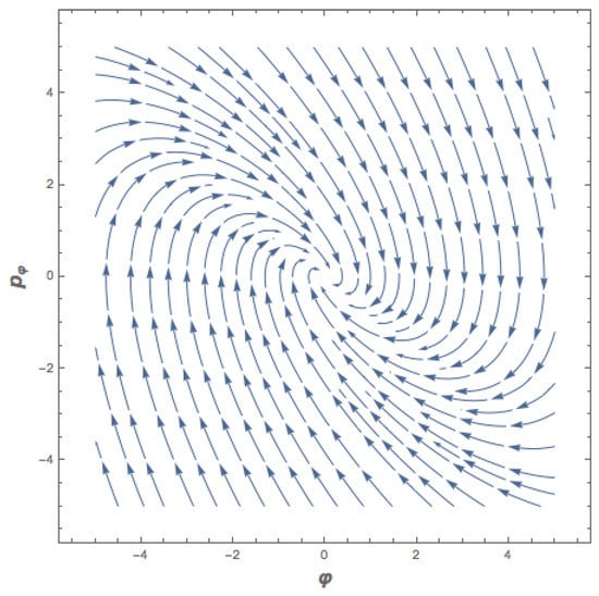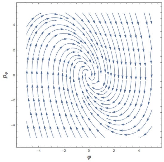 This pair of differential equations has the structure of an autonomous system []. The dynamical system (37) is already linear; consequently, the linear stability theory is not just an approximation around the critical point(s), but rather an exact description, completely adequate for the case in hand. The result stemming from this analysis should not suffer from any pathologies, such as those mentioned, e.g., in []—see also []. A quick inspection of (37) revels the equilibrium point: