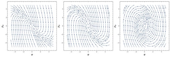 The analysis of the direction fields in the phase space allowed us to double check if stability is attained (in an enlarged region surrounding the equilibrium point []) and if it is consistent with the Lyapunov criterion. Here, we assumed that
