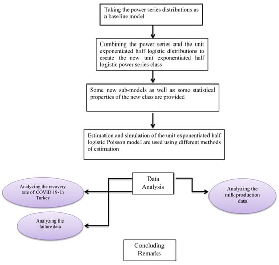 In recent decades, several studies have examined the creation of new probabilistic families by combining various distributions and the power series (PS) model. Most of the works have been motivated by systems consisting of series or parallel components. Most of the generalization is motivated by a system consisting of a series of components. For instance, Morais and Barreto-Souza [] presented the Weibull–PS class, discussed some statistical properties, thought about estimation using the maximum likelihood (ML) approach, and provided data analysis. Similar work was presented by Mahmoudi and Jafari [] and Silva et al. [] for the generalized exponential-PS and extended Weibull–PS classes, respectively, using generalized exponential and extended Weibull. Jafari and Tahmasebi [] discussed the class of the Gompertz PS, presented some properties, discussed the ML estimation procedure, and presented a simulation study for complete and censored data. Elbatal et al. [] introduced the class of exponential Pareto-PS. The Burr XII-PS class, as well as the Burr–Weibull–PS class, were introduced by Silva and Corderio [] and Oluyede et al. []. Alizadeh et al. [] investigated exponentiated power Lindley-PS class, discussed ML estimation, provided formulas for the elements of the Fisher information matrix, and examined real data sets. Alkarni [] introduced the generalized inverse Lindley PS class in his paper. The new Lindley–Burr XII PS class was recommended by Makubate et al. [], along with discussions of the properties class, estimation of the parameters, and real-world applications. The inverse gamma PS class was created by Rivera et al. []; estimation and data analysis are also provided. The inverted exponentiated Lomax PS class was proposed by Hassan et al. [], who also explained the properties class, estimated the parameter, and gave real data applications.