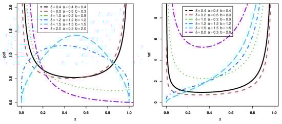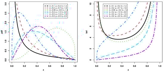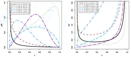 For b = 1 in (11), the unit half logistic Poisson distribution is produced. In Figure 2, the PDF and HF plots of the UEHLP distribution are displayed. The density is bathtub, symmetrical and reversed J-shaped, while the HF is a bathtub, increasing, J-shaped and decreasing.