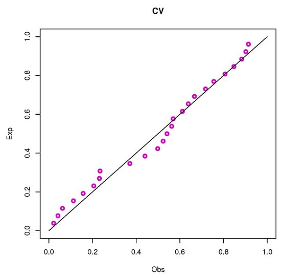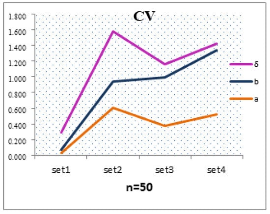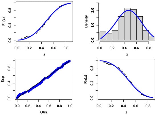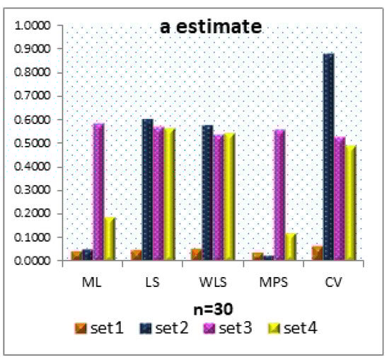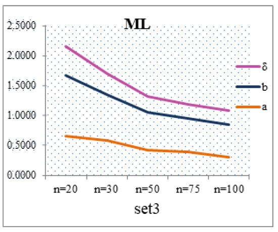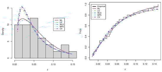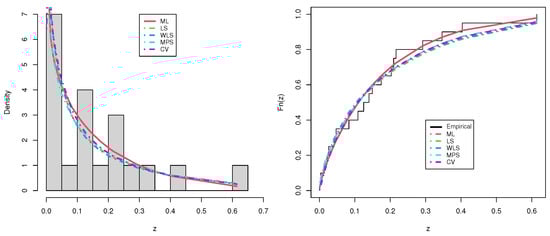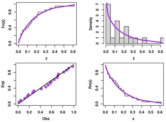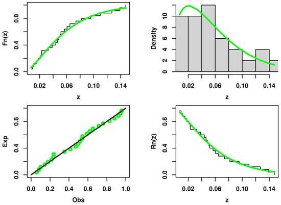 The second set of data relates to milk production. This data set includes the total milk production from 107 SINDI race cows’ first calves. The details can be found in []. The data set is: 0.4371, 0.4694, 0.5285, 0.5629, 0.6114, 0.6844, 0.7687, 0.0671, 0.2356, 0.3383, 0.3906, 0.4438, 0.0168, 0.4612, 0.515, 0.5553, 0.6012, 0.6768, 0.7471, 0.0609, 0.216, 0.3259, 0.3821, 0.4365, 0.4675, 0.3175, 0.3635, 0.426, 0.4576, 0.5232, 0.5627, 0.6058, 0.6789, 0.7629, 0.065, 0.2303, 0.3323, 0.3891, 0.4741, 0.5349, 0.5707, 0.6174, 0.686, 0.7804, 0.0776, 0.1546, 0.3188, 0.3751, 0.4332, 0.2361, 0.3406, 0.3945, 0.447, 0.4752, 0.535, 0.5744, 0.6196, 0.6891, 0.8147, 0.0854, 0.2605, 0.3413, 0.4049, 0.4517, 0.48, 0.5394, 0.577, 0.622, 0.6907, 0.8492, 0.1131, 0.2681, 0.348, 0.4111, 0.453, 0.4823, 0.5447, 0.5853, 0.6465, 0.6927, 0.8781, 0.1167, 0.2747, 0.3598, 0.4143, 0.4553, 0.499, 0.5481, 0.5878, 0.6488, 0.7131, 0.1479, 0.3134, 0.3627, 0.4151, 0.4564, 0.5113, 0.5483, 0.5912, 0.6707, 0.7261, 0.1525, 0.514, 0.5529, 0.5941, 0.675, 0.729. The third data set is taken from [] and is known as the failure components data; it is about the ordered failure of 20 components. The data set is: 0.2099, 0.2168, 0.2918, 9.00 × 10, 0.004, 0.1404, 0.1498, 0.175, 0.0261, 0.0418, 0.0473, 0.0834, 0.1091, 0.1252, 0.2031, 0.0142, 0.0221, 0.3465, 0.4035, 0.6143.
