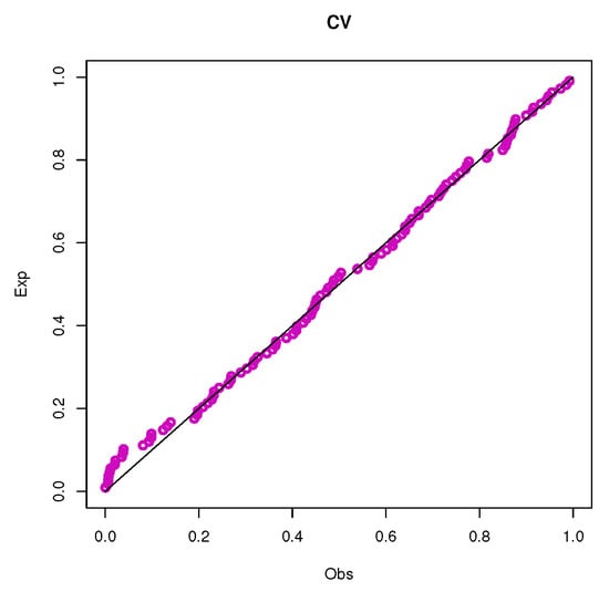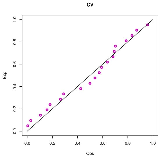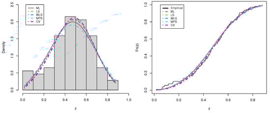 For the proposed model, the estimated parameters, CV, AN-D, KOS, and p-value are determined using various estimation techniques and are provided in Table 7, Table 8 and Table 9 for the three real data sets, respectively. For the three proposed real-world data sets, Figure 15, Figure 16, Figure 17, Figure 18, Figure 19 and Figure 20 show the plots of the estimated PDF, CDF, and PP plots of the UEHLP model utilizing ML, LS, WLS, MPS, and CV techniques of estimation. The ML approach is the best method of estimation for the numerical values in Table 7, Table 8 and Table 9.