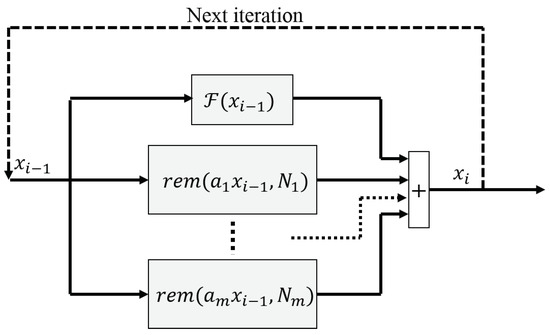 The proposed chaotification technique is an extension of [18] and consists of using the remainder operator to add multiple scalings of the map’s value into the next iteration as follows: