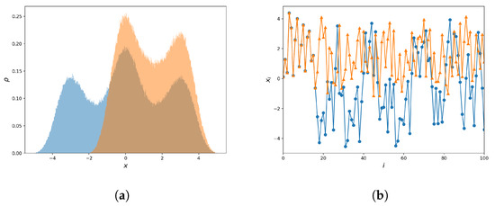 Again, the Lyapunov exponent value was also determined with respect to . The results are shown in Figure 14b. The obtained values show that for the entire analysed parameter range for the mapping (29). Moreover, is roughly constant for the whole range of parameter values. These results are consistent with the value of the Lyapunov exponent from Figure 14a. The obtained results confirm that the mapping (29) is characterised by interrupted chaotic behaviour for large ranges of parameter changes and, thus, has a much more complex behaviour than the base function Renyi Map (27).