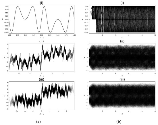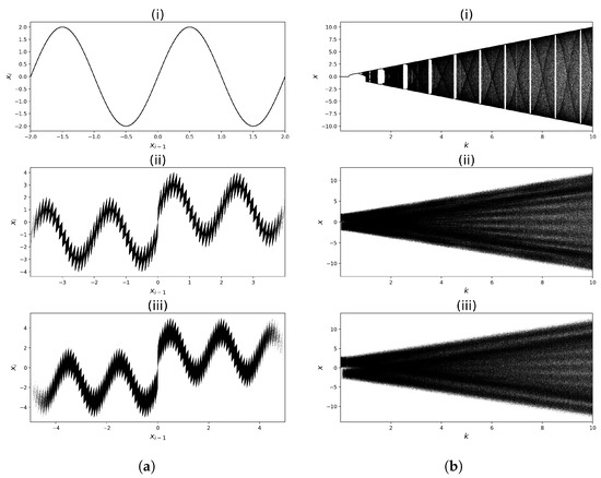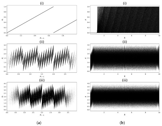 As in the earlier analysis, the phase diagrams of all three cases (Renyi Map (27) and its two modifications (28) and (29)) for fixed parameter values are presented in Figure 12a. These graphs confirm that adding multiple operators causes a significant complication in the base mapping. In turn, Figure 12b presents bifurcation diagrams of the analysed mappings. This figure shows that the behaviour of the Renyi Map (27) is also very complicated, with no visible periodic windows (the stable states occur in this map for ). However, the mappings (28) and (29) also do not have visible periodic windows. As in the previous cases, this situation means that choosing the mapping parameters in (28) or (29) will always result in a chaotic behaviour of the system.