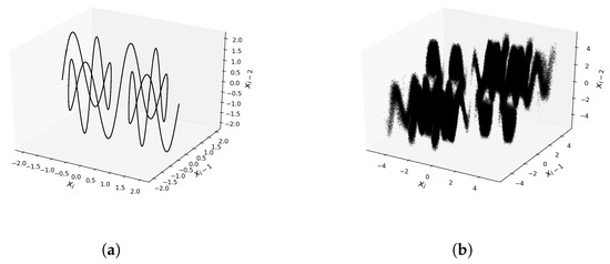The increased complexity of the resulting maps is also confirmed by the three-dimensional phase diagrams, which show the relation of points . These charts are presented in Figure 4. In the case of the Sine Map (17), the graph in Figure 4a shows that points fall on a curve, while for the modified maps (19) (Figure 4b), they fill up a 3D region, forming a cloud of points. Therefore, the mapping with the operators is much more complex than the base mapping.