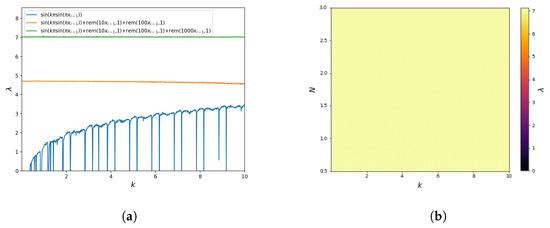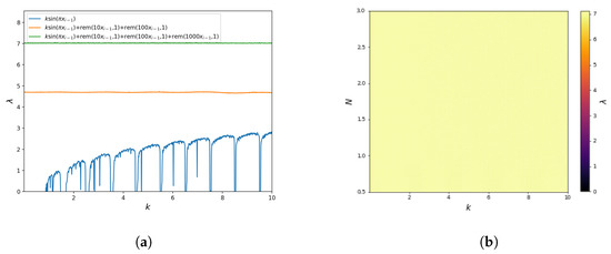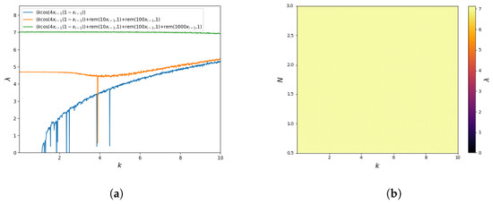 The respective plots of the Lyapunov exponent are shown in Figure 11a. The results are very similar to the Sine–-Sine Map. This figure clearly shows the presence of stable regions for the Cosine–Logistic Map (24) and their absence for the respective modified mappings with the operator. This figure also shows that the sensitivity to the change of initial conditions for the mappings (25) and (26) is roughly constant for the entire range of the parameter k. Thus, after the same number of iterations, the system will lose information about the initial conditions.