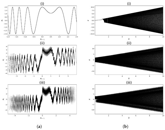 Moreover, for these mappings, the Lyapunov exponent value was determined as a function of . The results are shown in Figure 11b. The obtained values show that for the entire analysed parameter range for the mapping (26). Moreover, the value is roughly constant for the whole range of parameter values. These results are consistent with the value of the Lyapunov exponent from Figure 11a. Again, the obtained results confirm that the mapping (26) is characterised by interrupted chaotic behaviour for large ranges of parameter changes and, thus, has a much more complex behaviour than the base function Cosine–Logistic Map (24).