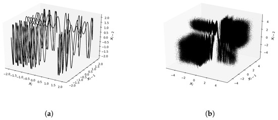 Figure 10a,b also depict the difference between the three-dimensional phase diagrams of the Cosine–Logistic Map (24) and the map (26). The original map has a curve diagram, but the modified map fills a wide 3D region.