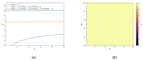 Similar to the analysis of the previous maps, plots of the Lyapunov exponent were also determined in this case, showing the system’s sensitivity to the change of the initial conditions. The plot of the Lyapunov exponent is shown in Figure 14a. The obtained results are very similar to the previous case. This figure clearly shows the presence of stable regions for the Renyi Map (27) and their absence for mappings with the operator. This figure also shows that the sensitivity to the change of initial conditions for the mappings (28) and (29) is roughly constant for the entire range of the parameter k. Thus, after the same number of iterations, the system will lose information about the initial conditions.