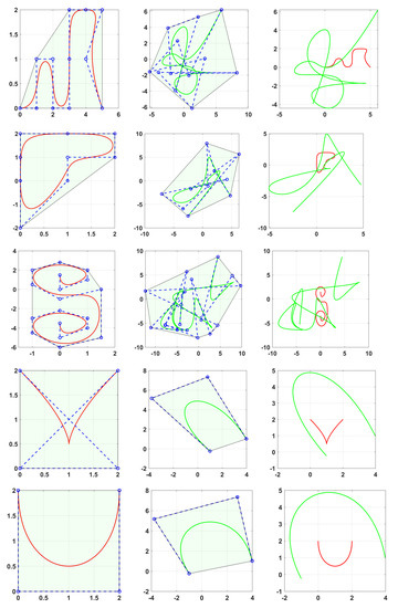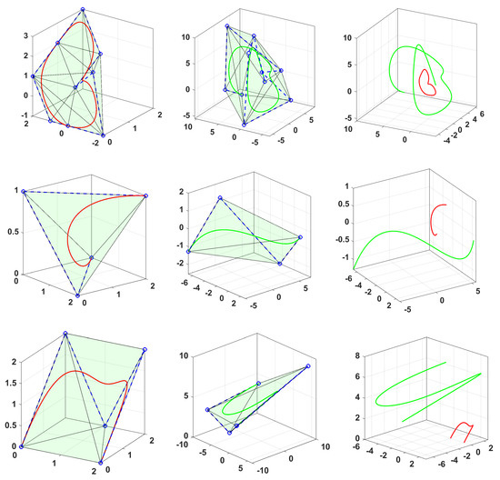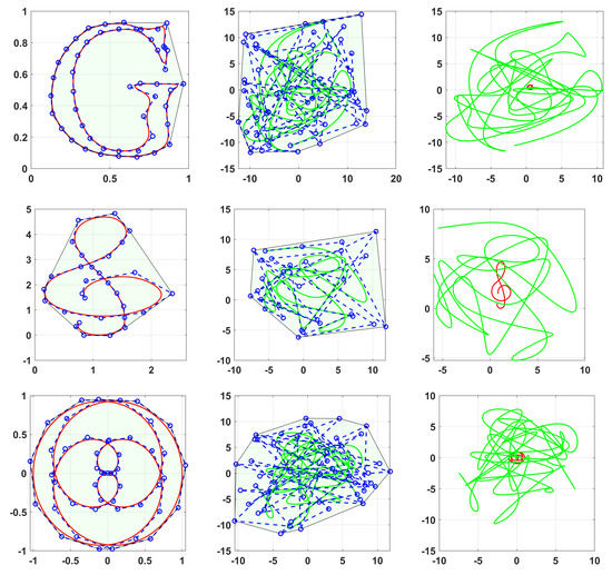 The encryption design is tested on a collection of several 2D and 3D cubic B-splines. Here, . Figure 15, Figure 16 and Figure 17 show a collection of cubic B-spline curves to be used for encryption, along with their convex hulls, and the corresponding encrypted curves. The encrypted curves have no visual similarity to the corresponding plaintext ones. The curves in Figure 16 are taken from [31]. The curves were generated using the algorithms described in [30,40].