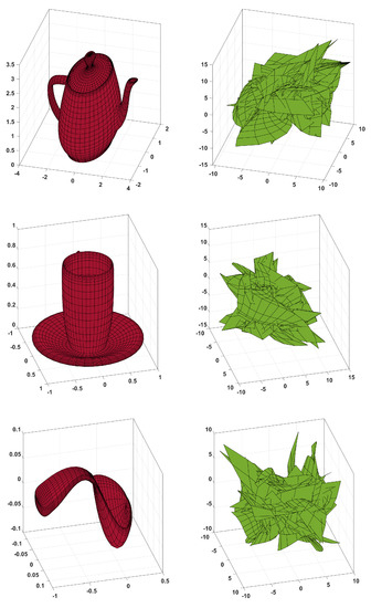 Figure 18 shows a collection of three patches and the respective encrypted ones. The encrypted patches are again visually dissimilar from the corresponding plaintext patch. Moreover, the encryption of the Utah teapot, teacup, and teaspoon is considered, with data taken from [41]. The data available consist of a .txt file of control points and a secondary .txt file indicating the control point indexes in the first file, for each patch. The results are shown in Figure 19. The teapot consists of 32 patches; the cup is 26 patches; the spoon is 16 patches. The resulting ciphertext collection of patches clearly has no distinguishable shape. Note that, for the ease of implementation, the reshaping of the control points into a single vector (52) is performed directly to the .txt file provided in [41].