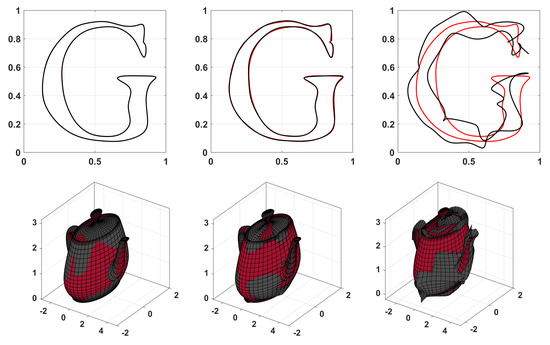 Examples of plaintext (red) and decrypted (black) curve, where noise is added in the encrypted data. The noise is added as a uniform random series in the interval . For the “G” curve, (left), (middle), (right). For the teapot, (left), (middle), (right).