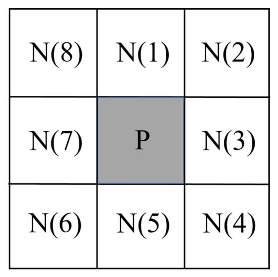 We define the logic value of contour curve pixels as 1 (true) and background pixels as 0 (false). is the number of non-zero pixel points in the eight fields of P, and is the number of non-zero pixel points in , , , and , as shown in Figure 1.