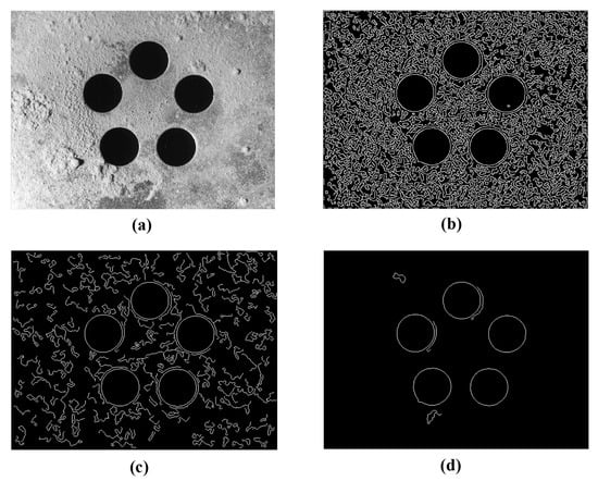 The intermediate results of our procedure are shown: (a) the original image. (b) The results of the original fuzzy inference edge extraction. (c) The image after we performed the main contour edge screening and contour refinement. (d) The image after we performed the arc-like determination.