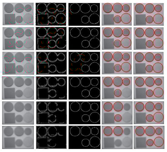 Figure 5 shows the detection capability of our algorithm for Gaussian-filtered images, where the first image in each row represents Gaussian-filtered images with different window sizes, the second image is the result extracted by the original fuzzy inference edge detection algorithm, the third image is the result extracted by our improved fuzzy inference algorithm, the fourth image is the circle detection result extracted by the original fuzzy inference edge detection algorithm, and the fifth image is the result of our circle detection.