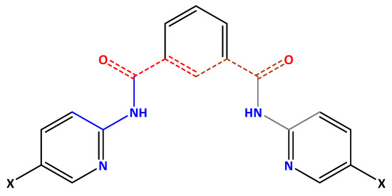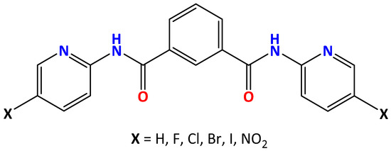 The N1,N3-bis(5-X-pyridin-2-yl)isophthalamides (X = H, F to I, NO2) or X-DIPs as depicted in the anti/anti conformation (with respect to the amide groups).
