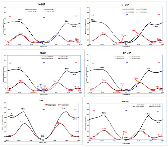 Conformational analysis is a useful approach to understand the relationships between energy and geometry [17,18,19,20]. The possibility of attaining different conformational preferences as influenced by steric and electronic factors may be realised by varying the position of carbonyl groups relative to the aromatic rings and to the position of the N atom in the pyridine rings (Figure 7). Because the substituents atoms are located para, the effect of pyridine ring rotation is not influenced by the para-substituent nature. Only the position of the pyridine ring with respect to the amide linkage is responsible for the change in the energy as shown in PES diagrams (Figure 8) as represented by a blue curve. The lowest energy is obtained by having the Npyridine in the opposite direction to the carbonyl group and planar with the amide linkage. The rotation of the pyridine ring in the syn-syn conformation to the perpendicular position increases the molecular energy (TSNI) by 36.5 ± 0.5 kJ mol−1 (as for F-DIP increasing to 34 kJ mol−1 and for NO2-DIP to 44 kJ mol−1). If the rotation occurs with the Npyridine in the same direction of the carbonyl group, it increases the energy of molecule (TSNII) by 38.1 ± 0.5 kJ mol−1 (only NO2-DIP increases to 44 kJ mol−1). In I-DIP, the energy increase reaches 56.8 kJ mol−1and 57 kJ mol−1, respectively. This highlights and ties in with the analysis of the X-DIP crystal structures that their torsion angles are always close to the global minimum point (Figure 8).