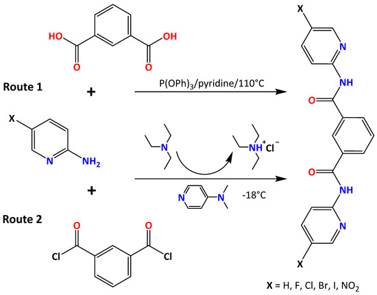 Two procedures were used in the isophthalamide synthesis (as described for 2-aminopyridine). Both involved standard condensation procedures and differed by using isophthalic acid (route 1) and isophthaloyl dichloride (route 2) as starting materials and the subsequent workup (Scheme 2) [25].