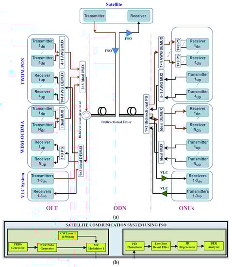 Figure 2a illustrates the block diagram illustrating the suggested design employing four subsystems, viz. satellite, TWDM-PON, WDM-OCDMA as well as VLC. Figure 2b illustrates the satellite communication system using FSO links employing on-off keying modulation scheme. It indicates that the FSO links that carry the data from an earth station to the satellite in orbit. Here, at the earth station (Tx side), the incoming optical signal from a continuous wave (CW) laser diode (LD) is modulated with a pseudo-random bit sequence non-return to zero (PRBS-NRZ) digital signals through Mach-Zehnder modulator (MZM). Then an adequate signal is passed through modulated GG FSO turbulence channel towards the satellite and vice versa [21,22,23]. After this, at the satellite (Rx side), the optical signals are converted into electrical signals using a photodetector (PD). Then the low-pass Bessel filter (LPF) is used to filter out the noises from the original information [24,25,26]. A 3R regenerator is used to regenerate the distorted signal followed by the BER analyzer to analyze the system performance w.r.t. quality-factor (QF), BER, eye diagrams and eye height [26,27,28,29,30,31].