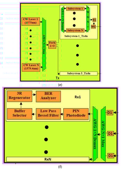 Figure 2d depicts the TWDM design incorporating 32 undersea devices transmitting aggregate 10 Gbps NRZ-PRBS data signals by modulating four CW LDs which generated four UP wavelengths (1527.2 nm–1529.6 nm with 0.8 nm spectral width) at Pin = 0 dBm using an MZM modulator. Furthermore, two Y-cascaded dynamic selects devices were employed with distinct switching times (0–1.6 ns) for all UP wavelengths. The received signals were forwarded to an Ideal MUX followed by AWG MUX at a remote node (RN). Then, on the OLT side, bidirectional SMF was used to receive the incoming signals. Following this, these signals passed through AWG DEMUX and passed to the CO side [11,33]. The receiver section for the uplink is presented in Figure 2c.