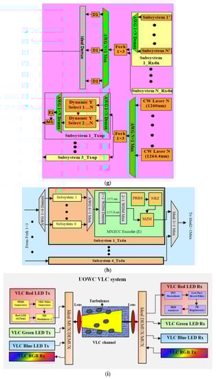 Figure 2i illustrates the NOMA-VLC system based on RGB LEDs for UOWC using three red, green and blue LEDs to offer the required bandwidth and small beam divergence. For the downlink UOWC VLC system, NRZ-OOK modulation was incorporated to modulate three input LED (red, green and blue) signals. After that, the signals were multiplexed using a 1 × 3 ideal MUX to transmit over ODN and VLC channels. The VLC signal was transmitted through a sea channel considering primarily weak turbulence, scattering as well as absorption losses employing a lens at the transmitter as well as receiver sides to center the incoming light in the water channel [11,33].