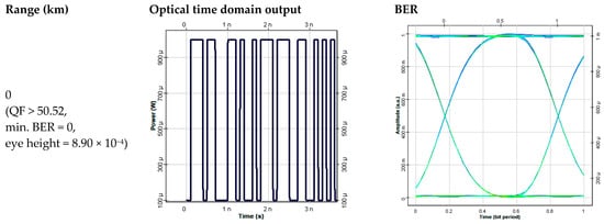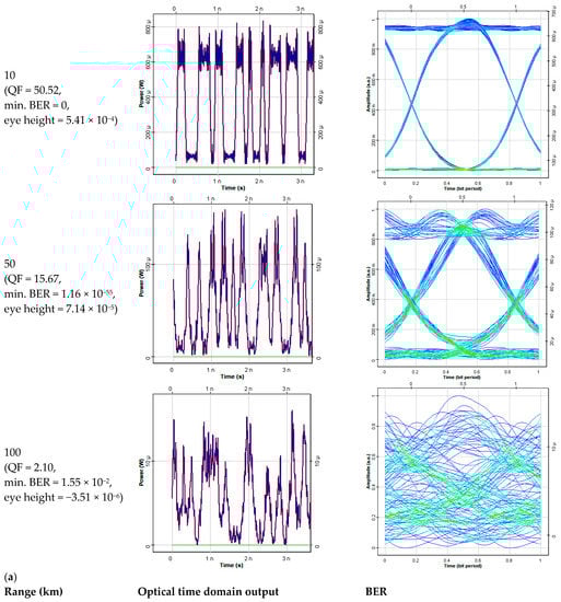Moreover, the respective eye patterns over 0, 10, 50 and 100 km fiber length are also depicted in Figure 8a for downlink and in Figure 8b for uplink to support the above discussions. As the eye-opening diminishes, i.e., eye distortion increases, BER improves and QF decrease with the improvement in fiber length. The better performance can be seen for uplink channels.