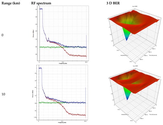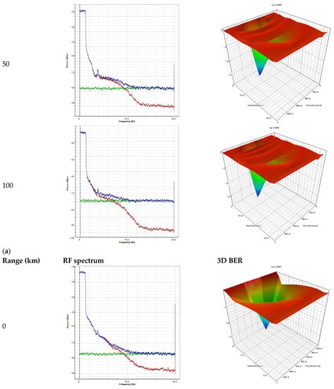 Figure 9a,b presents the performance of the proposed system over variable fiber distance in terms of RF spectra and its respective 3D BER patterns for DN and UP received signals, respectively. The fiber distance increases from back-to-back to 100 km and the RF spectra become distorted and comprise low output power. Again, UP transmission (minimum ROP = −95 dBm) shows a better performance than DN transmission (minimum ROP = −100 dBm) over various fiber lengths. The 3D BER patterns for both DN and UP (Figure 9a,b) present that data transmission in UP outperforms DN by providing clear and fewer ripples BER patterns.