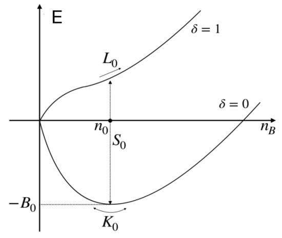 where denote the binding energy, incompressibility, symmetry energy, and slope parameter, respectively, as shown in Figure 2. The parameter measures the curvature of the energy density at the normal nuclear density: