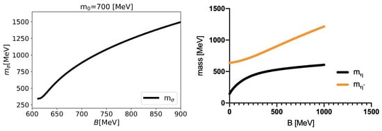 One of the key features is that both the condensate and are enhanced when the effect of anomaly is included. Their values in a vacuum are actually increased with an increasing B. Since the mass of the meson, , is proportional to , the mass is increased, as shown in Figure 4. In the potential picture for nucleons, the meson mediates the attractive force among nucleons in the matter so that the larger leads to a shorter effective range of the attraction with a weaker overall strength. The repulsive interaction should be weaker to balance the weaker attraction. As a result, the weaker repulsion for a larger B makes the softer EOS in the density region higher than the normal nuclear density.