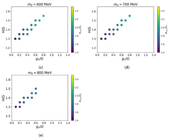 In Figure 3, we show the range between and needed to satisfy the saturation properties. Finally, we fit parameter B to reproduce the masses of the and mesons. Here, we omit the details and show the determined values of the model parameters only for MeV as a typical example in Table 3. We refer to Ref. [67] for the details of the determination and the values of the model parameters for other choices of .