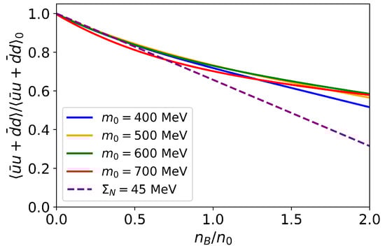 Here, are Gell-Mann matrices in color space, where and are the Gell-Mann matrices, and is a charge matrix in flavor space. Meanwhile, and are the Gell-Mann matrices for the flavor. For the coupling constants G and K, as well as the cutoff , we use , , and MeV, which successfully reproduce the hadron phenomenology at a low energy [26,75]. The mean fields are introduced as