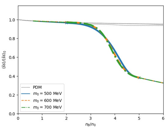The PDM as a hadronic model does not describe the chiral restoration at the quark level, such as the modification in the quark Dirac sea. In order to supply such a qualitative trend, the quark matter EOS plays a role as a high-density boundary condition. For the quark matter, a three-flavor Nambu–Jona-Lasinio (NJL)-type model, which leads to the color-flavor locked (CFL) color-superconducting matter (for a review, see Ref. [63]), is adopted. The effective interactions are examined to fulfill the two-solar-mass () constraint [27,28,64,65]. In Refs. [58,61], they construct an effective model combining a PDM and an NJL-type model with two flavors assuming no color-superconductivity.
