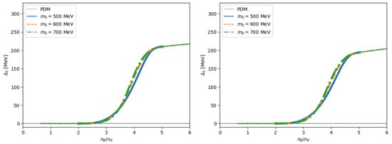 For the construction of the nuclear EOS, we implement a PDM into the Walecka-type mean field model with , , and [34,35,36]. The strangeness is included at the level of the anomaly where the scalar mesons with strangeness, , couple to a made of up- and down-quarks. For a neutron star EOS based on the PDM, see, e.g., Refs. [37,38,39,40,41,42,43,44,45,46,47,48,49,50,51,52,53,54,55,56,57,58,59,60,61,62]. The most notable feature of the PDM is the density dependence of the nucleon mass. The chiral invariant mass allows nucleons to stay massive during the reduction in . In the dilute regime, the decreases linearly as a function of , as does the nucleon mass if is absent; the nucleon mass at is ≃30–50% smaller than the vacuum mass. With a larger , the mass reduction becomes more modest. In addition, nucleon fields need not couple to very strongly to reproduce the nucleon mass MeV; in the Walecka-type model, this results in a weaker coupling between the nucleons and fields because such models have been arranged to balance the attractive and repulsive contributions to reproduce the nuclear matter properties at . Beyond , the attractive contributions decrease while the repulsive contributions keep growing. Thus, a greater makes the overall magnitude of the and contributions smaller, and the resulting softer repulsion improves the consistency with the radius constraints on NS, for which the EOS at - is most important.