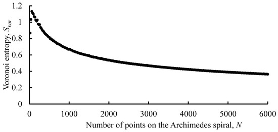 where i is the number of polygon types, and Pi is the fraction of polygons possessing n sides (edges) inherent for a given Voronoi diagram (also called the coordination number of the polygon) [2,12,22,23]. The Voronoi entropy becomes zero for a perfectly ordered structure (when we have polygons of only a single kind), and it is increased with the number of types of polygons. For a typical case of fully random 2D distribution, the value of Svor = 1.71 was reported [25,26]; six types of polygons are inherent in these patterns. Equation (1) is similar in its form to the statistical measure of information and entropy in statistical mechanics [27]. That is why it was called “the Voronoi entropy”, which is also labeled in the literature as the Shannon entropy. We also address the aesthetic appeal of the Voronoi patterns generated by Archimedes’ spiral [28].