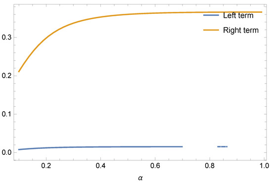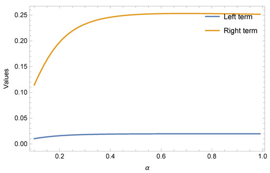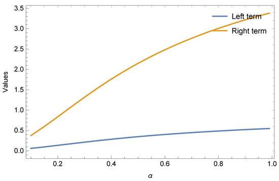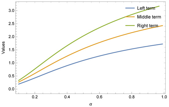 If we choose subadditive functions and respectively, in Theorem 5 for all , and , then we get the following results given in Table 3 and Table 4 and Figure 3 and Figure 4 for Inequalities (14) and (15), separately.