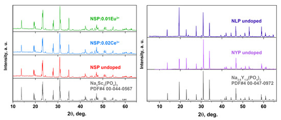 A set of phosphates, Na3.6Y1.8(PO4)3 (NYP), undoped and doped with 0.4 mol%Tb3+, 0.04 mol%Dy3+, or 0.7 mol%Eu3+; Na3.6Lu1.8(PO4)3 (NLP), undoped and doped with 0.4 mol%Tb3+, 0.1 mol%Dy3+, or 0.5 mol%Eu3+; and Na3Sc2(PO4)3 (NSP), undoped and doped with 0.02 mol%Ce3+ or 0.01 mol%Eu3+ were synthesized using a high-temperature solid-state method. The concentrations of the RE activators were selected corresponding to the highest RE emission intensities based on the results of our previous studies of some phosphates [7,23]. For simplicity, impurity concentrations are given without units in chemical formulae later in the text.