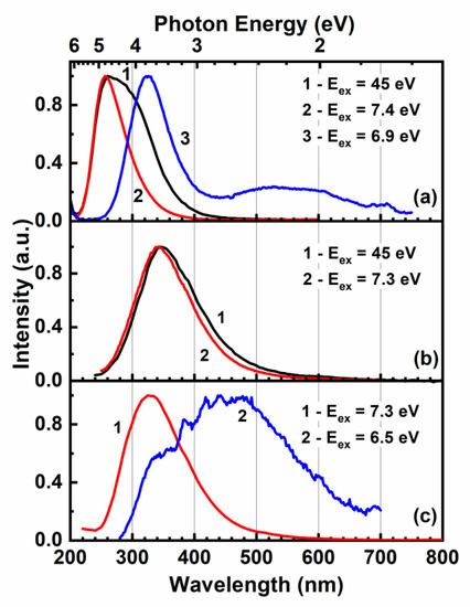 The luminescence spectra of undoped phosphates at different excitation energies are presented in Figure 2. Two broad overlapping UV emission bands were observed for NSP in the ultraviolet spectral region under the interband excitation, while only single UV emission bands peaking at 330 and 340 nm were detected for NYP and NLP, respectively. The overlapping bands in NSP can be separated using selective excitation at lower energies. In this case, two emission bands peaking at 260 and 325 nm were correspondingly registered at Eex = 7.4 eV (168 nm) and Eex = 6.9 eV (180 nm) (Figure 2a). Weak additional broad bands in the visible spectral region peaking at ~530 nm for NSP and at ~480 nm for NYP were also detected (Figure 2a,c).