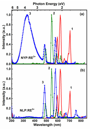 Luminescence spectra for NYP:RE and NLP:RE (RE = Eu, Tb, Dy) compounds under VUV excitation are presented in Figure 4a,b. Narrow emission bands characteristic of the given RE ions were observed. The luminescence spectra of Eu3+-doped samples demonstrate a set of emission bands with maxima at 595, 620, 655 and 705 nm, which correspond to the intraconfigurational 5D0 → 7FJ (j = 1,2,3,4) transitions in the Eu3+ ion (Figure 4a,b, curve 1) [12]. The most intense peak at 620 nm is attributed to the 5D0 → 7F2 electric dipole transition, indicating a low site symmetry for Eu3+ ions in the NASICON host. Luminescence spectrum of Tb3+-doped compounds consists of a typical set of bands at 490, 545, 585 and 625 nm corresponding to the 5D4 → 7Fj (j = 6,5,4,3) transitions in the Tb3+ ion. Weak bands in the region 360–460 nm are related to the 5D3 → 7F6,5,4,3 transitions in Tb3+ [28,29,30]. Luminescence spectrum of Dy3+-doped compounds consists of a set of lines peaking at 486, 578 and 670 nm, corresponding to the intraconfigurational 4f-4f transitions from the Dy3+ 4F9/2 excited state to the 6H15/2, 6H13/2, and 6H11/2 states, respectively (Figure 4a,b, curve 3). A defect-related broad UV emission band is observed only in Dy3+-doped samples.