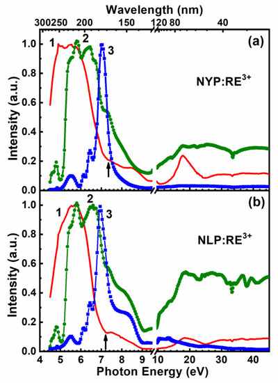The excitation spectra of RE3+ emission are shown in Figure 5a,b. At energies below the bandgap, the spectra demonstrate features related to direct transitions involving RE3+ electronic states. A broad band at ~5.6 eV spread over the region of 4.5–7 eV in the excitation spectrum of Eu-doped NYP and NLP is attributed to the 2p O–4f Eu charge transfer transitions. In luminescence excitation spectra of Tb-doped NYP and NLP, a broad non-elementary band in the region 5–7 eV corresponds to the 4f-5d transitions, while a weak band peaked at 4.8 eV is related to the 7F6–5K9 transitions within the 4f states of Tb3+ ions (Figure 5a,b, curve 2). The excitation spectra of the Dy3+ emission are represented by weak peaks below 5 eV connected with the intracentre 4f-4f transitions (namely 6H15/2–4P5/2) [31] and an intense peak at ~7 eV, which has previously been associated with a charge transfer transition from 2p O to 4f Dy states or with an exciton localized near the Dy impurity [7] (Figure 5a,b, curve 3). According to the model proposed in [32], it is possible to estimate the positions of charge transfer bands for various RE3+ ions, based on the position known for one RE ion. In particular, the model predicts that the position of charge transfer band for Dy3+ ion will be shifted by 2.27 eV to higher energies in comparison to that of Eu3+ ion. Therefore, we can estimate the charge transfer band position for Dy3+ ion using the abovementioned value for Eu3+: 5.6 eV + 2.27 eV = 7.87 eV. Thus, the peak at ~7 eV in the luminescence excitation spectrum of NYP:Dy3+ cannot be associated with charge transfer transition, but can be attributed to the excitons localized near Dy impurities.