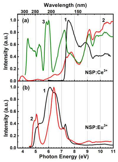 The excitation spectrum of Eu3+ emission in the NSP:Eu3+ phosphor is characterized by a broad structured band in the region of 4.8–7.3 eV. It peaks at 6.1 eV and is most likely related to charge transfer from the 2p O to 4f Eu states (Figure 7b, curve 1). The dips at 5.1 and 6.4 eV arise due to the competition with the excitation of Eu2+ ions, whose excitation spectrum demonstrates peaks at exactly these energies (Figure 7b, curve 2). At the high-energy wing of the charge transfer band, a narrow peak is observed at energy 7.3 eV, which corresponds to the region of the fundamental absorption edge, while at higher energies the excitation intensity drops almost to zero indicating low efficiency of the energy transfer from the host to Eu3+. A similar behaviour is observed for the excitation spectrum of the Eu2+ emission. As a result, the most intensive emission band under interband excitation is the intrinsic band at 260 nm, which indicates that the formation of self-trapped excitons and their radiative annihilation is the most probable radiative process under high-energy excitation of NSP samples, both RE-doped and undoped.