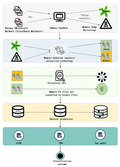 To combat such threats, much research is carried out in various fields, including deep learning, memory forensics, number theory, and so on [4,5,6]. Memory forensics offers unique insights into the internal state of kernel system and running programs [7]. Memory has a high potential to contain malicious code from an infection, in whole or in part, even if it is never written to disk, because it must be loaded in memory to execute [8]. The analysis target of memory forensics is a memory dump from where the attack traces can be extracted. By contrast, these traces are not available by the traditional disk analysis method. During memory analysis, malwares are executed in a sandbox to prevent the malwares from causing damage to the entire computer system, which is accomplished by establishing virtual machines. Memory data must be collected in a timely manner when malware is running on the virtual machine (VM). In this paper, the memory data are dumped to the disk using the memory dump algorithm for further analysis. In addition to dumping the memory data, malicious portable executable (PE) files must be extracted from thousands of memory data as sample data. Bozkir et al. [9] presented an approach to recognize malware by capturing the memory dump of suspicious processes, which can be represented as an RGB image. However, collecting malicious memory data in this manner is inadequate. The extracted process potentially did not load malicious code into memory. Some malicious processes are injected into new processes to perform malicious actions. In this case, extracting a single malicious process cannot fully reflect the malicious behavior of the process. Only extracting a malicious running single process cannot fully reflect the value of memory analysis. The dataset in this paper takes multiple dumps of memory images and extracts all processes and DLL data. By close analysis of this information, benign and malicious data can be classified through a detection platform.