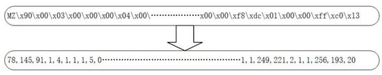 The dataset of the memory file is considerably different from the text dataset of natural language processing. We first preprocess the dataset by using natural language word segmentation; that is, by converting binary data into single words and then conducting word embedding. However, when the model is used to train the processed samples, the training result is inferior, with an accuracy of approximately 0.5, which is of no value for dichotomy classification. After conducting research, it is found that the memory PE binary file has many consecutive 0 s appearing in the file, which cannot be effectively learned for the data after the word segmentation. Several studies [9,32] converted the binary data into images as datasets. A previous study [14] directly learned the binary files during data preprocessing. Figure 3 shows our operations on the data type transformation of the dataset. The value range of the 8-bit binary number is 0–255, and the value of the image is also 0–255. Since convolutional neural networks perform well in image classification, we convert every eight binary bits of the malicious code to a decimal, making it a similar form to image numerical values. The training data should be cut to the same length before being added to the training model. We first add 1 to the data in the dataset, and then for data more minor than the length, 0 is used to fill in the data to avoid mixing with the actual data.
