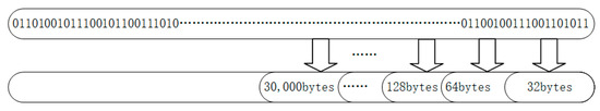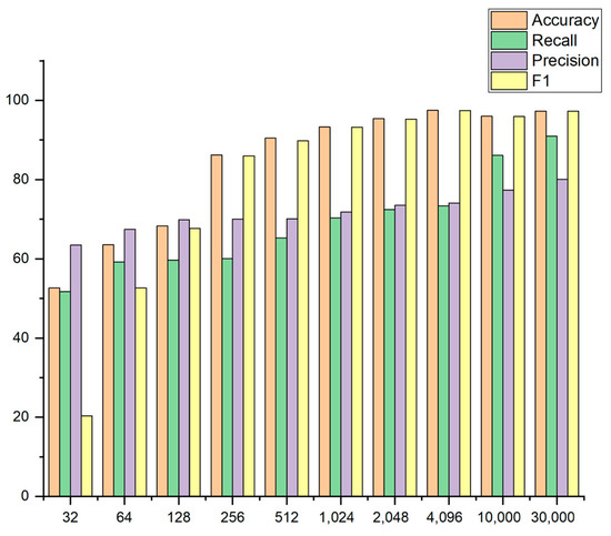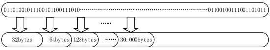 - As is shown in Figure 4, the sample header is selected for fragmentation, and the lengths of the header for the fragmentation are 32, 64, 128, 256, 512, 1024, 2048, 4096, 10,000, and 30,000 bytes. The effect of taking different lengths of the sample fragments on the model’s accuracy is observed through experiments. Additionally, the method of sample fragment training can also improve the detection efficiency of the model and significantly reduce the time taken for sample detection;
