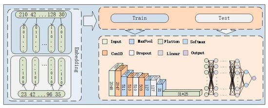 In the selection process of the deep learning model, long short-term memory [33] (LSTM) is firstly used for the experiments. LSTM is relatively mature in the field of natural language processing [34,35,36]. However, the experimental results show that the time cost of model training is higher than that for CNN. Owing to the complex and diverse forms of malicious code, the features extracted by the CNN have translation invariance characteristics [37]. As the location of malicious code is not fixed, CNN is more suitable for the malicious code detection in binary PE files. In addition, with the increasing length of sequence fragments, the computation amount of the LSTM model will be very large and the procedure is time-consuming. Although the training duration of the ordinary CNN model is shorter than that of the LSTM, the training effect of CNN is similar to that of LSTM in terms of accuracy. Our model architecture is designed to maximize learning from preprocessed samples, as shown in Figure 7. We adopted a network model with a 12-layer structure based on CNN, in which we primarily used multiple convolutional layers for the model’s architecture. To prevent overfitting of the model during training, we added multiple dropout layers. The general dropout layer hides a quarter of the neuron nodes. In the study that proposed the famous VGG structure, Simonyan and Zisserman [21] observed that for a given receiving field, the performance of the stacked small convolutional kernel is better than that of the large convolutional kernel because multiple nonlinear layers can increase the network depth. Hence, the convolution kernels used in this study are small. For the optimizer in deep learning, the accuracy rate of Adam was found to be better than that of the SGD. Therefore, Adam was adopted, and a cross-entropy loss function was adopted for the loss function of deep learning back propagation. The pre-processed dataset in Section 4.2 is one-dimensional data, so the one-dimensional convolutional neural network (CNN1D) is adopted in our model. The difference between CNN1D and CNN is that CNN is mainly used for the detection of two-dimensional images, while CNN1D is used for the detection of one-dimensional data. We use CNN1D to input one-dimensional data into the model with a multi-channel mode, and then we do continuous translation calculation by the convolution kernel. The tag values are compared by using the softmax function. Finally, the cross entropy loss function is used for back propagation to optimize the model; thus, achieving the accurate detection of malicious code detection can be achieved with high accuracy. The processing procedure of LSTM model is similar to the above method. The preprocessed one-dimensional data are also input to the LSTM model for training and malicious code detection can be realized.