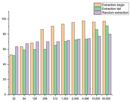 As seen from Figure 9, when the sample is sampled at the head, the prediction accuracy of the model is the highest, and the head has more features because the head contains the most critical feature information. The accuracy of tail extraction is the lowest, indicating that the tail includes the least number of key features. This is because only the critical data are called in the memory when the sample runs. Additionally, owing to the page replacement mechanism of the memory, as the system runs for a longer time, pages are constantly swapped into the memory, and pages existing in the memory are also temporarily swapped out, resulting in the least number of data features in the tail of the sample. Although random extraction is random for the location of different samples, it exhibits good accuracy. Furthermore, when the length of training data is greater than 10,000, the accuracy of tail extraction is high.