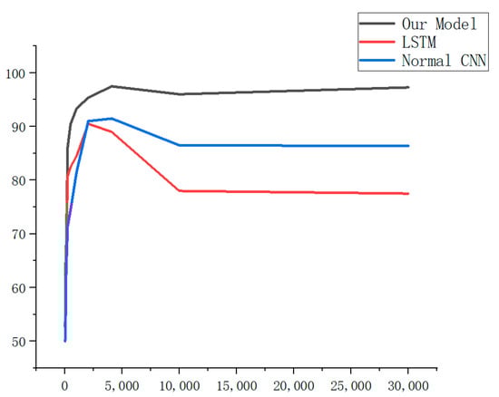 To verify the advantages of the proposed model, we perform comparative experiments with the common deep learning model LSTM and CNN. Table 4 lists the results of the comparison. Additionally, we conduct several experiments on these models and find out the optimal results. Extensive experiments show that the proposed model outperforms the compared models. In particular, the longer the sample sequence, the longer the time to train the LSTM. For the same sequence length, the proposed model takes 6 h to train, while the LSTM takes 30 h, and the training effect is less accurate than that of the proposed model. There is a negligible difference between the ordinary CNN training and research training time. Figure 10 illustrates that the proposed model is superior in terms of accuracy.