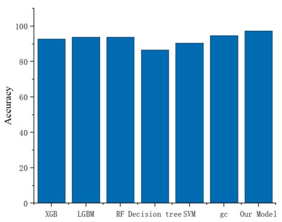 Figure 11 shows the best performance accuracy of the machine learning methods in Table 2. Different machine learning methods also have obvious differences. Among them, decision tree has the worst performance on our dataset, and DF has the best performance, but our model still has high accuracy.